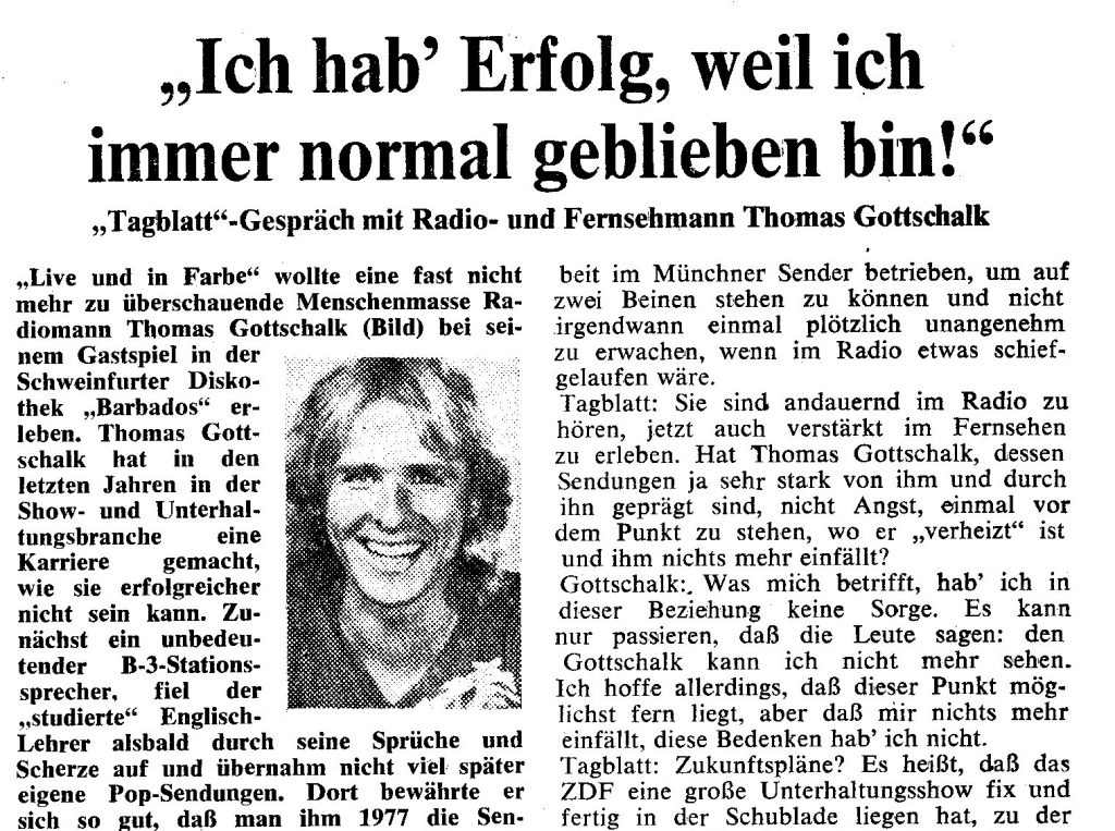Thomas Gottschalk war bei unserem Treffen noch nicht mal 30 Jahre alt. Knapp ein Jahrzehnt später wird er mit „Wetten, dass…“ Europas erfolgreichste Show moderieren und zu einem der größten Entertainer in Deutschland aufsteigen, mit nicht selten bis zu 20 Millionen Zuschauern vor den Bildschirmen.